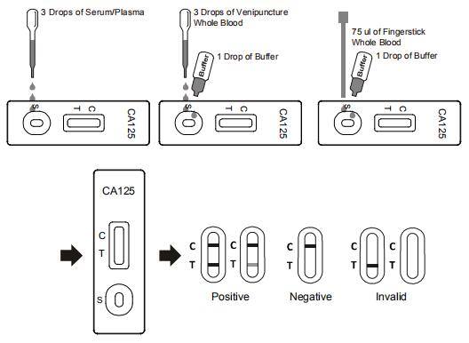 Hold the dropper vertically and transfer 3 drops of whole blood (approximately 75 ul) to the specimen well (S) of the test cassette, and add 1 drop of buffer (approximately 40 ul), then start the timer. See illustration below.