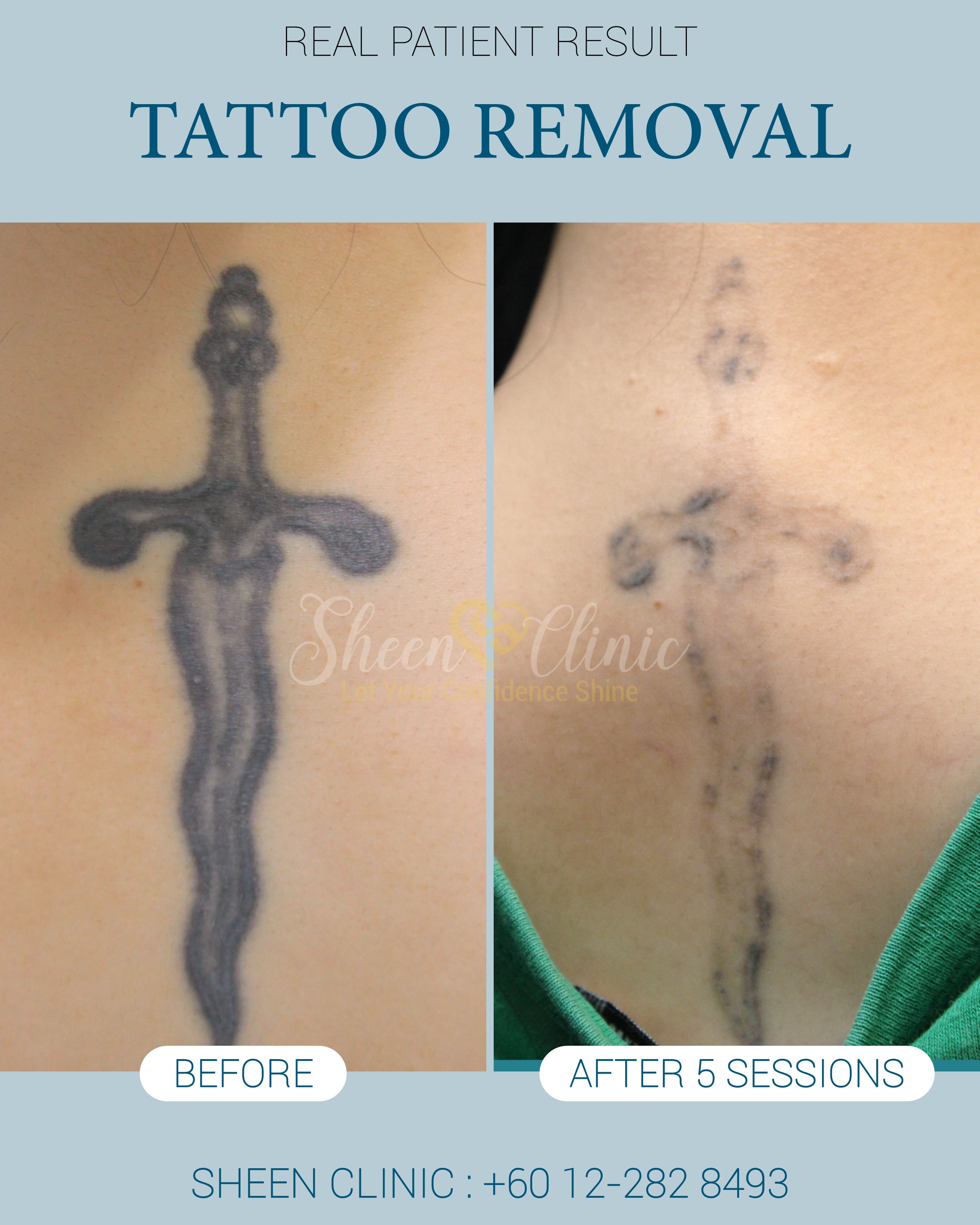Real Patent's Before- after photo show Tattoo ink reduction after 5 sessions of PICO laser