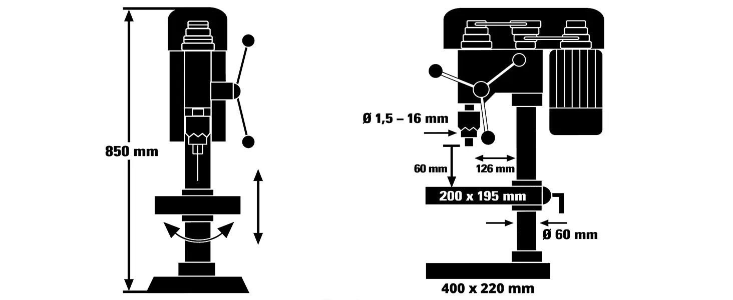 | With the help of the 12-stage speed regulation, the speed between 200 and 2,450 rpm can be adjusted to the respective material and application without tools, precisely and according to the material. | For maximum flexibility, the drilling table is infinitely adjustable in height, rotatable up to 90° and tiltable up to 45°. The robust steel base ensures the necessary stability of the bench drill. | With the adjustable, robust depth stop, the precisely desired drilling depth can be defined up to maximum of 60 mm. In this way, precise and fast drilling is also possible in series. | Thanks to the MK2 adapter and the robust sprocket chuck, all common Morse taoer drills and drills with a drill diameter between 1.5 and 16 mm can be inserted into the bench drill. |