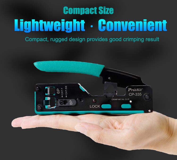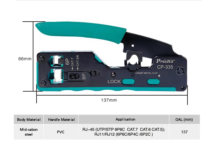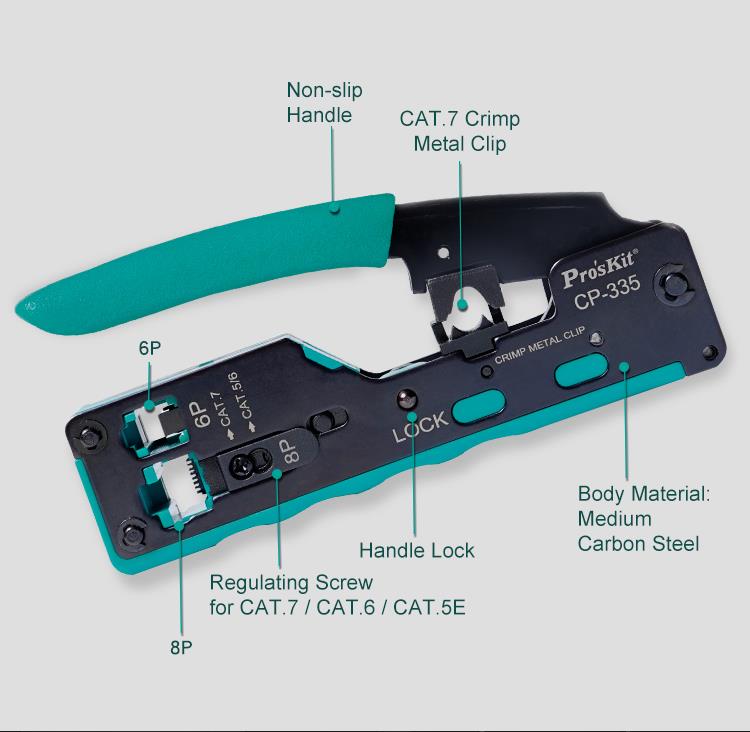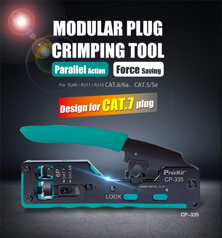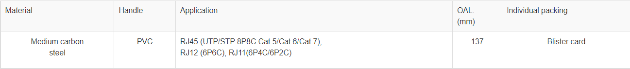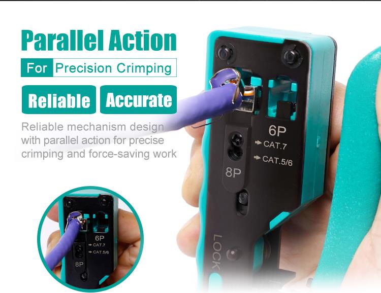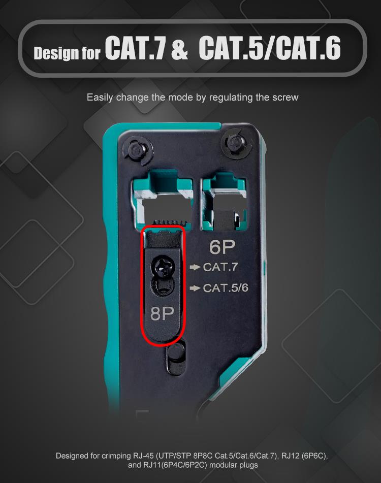 • Designed for crimping RJ-45 (UTP/STP 8P8C Cat.5/Cat.6/Cat.7), RJ12 (6P6C), and RJ11(6P4C/6P2C) modular plugs.