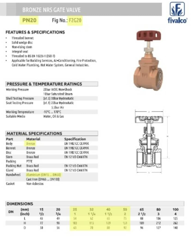 FIVALCO F2G20 25A (DN25/1'') BRONZE NRS GATE VALVE SC.END BSPT PN20 (W/P:20BAR)