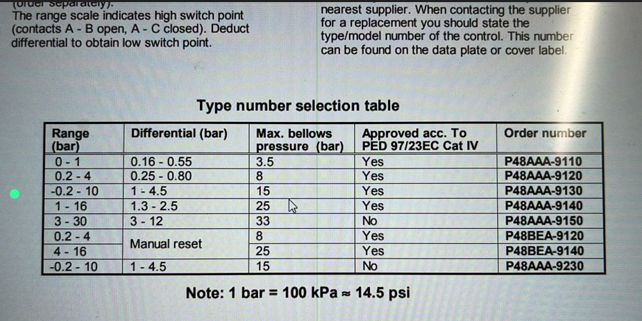 JOHNSON CONTROLS (PENN) P48AAA-9130 PRESSURE CONTROL (RANGE:-0.02/1MPA/-0.2 TO 10 BAR)