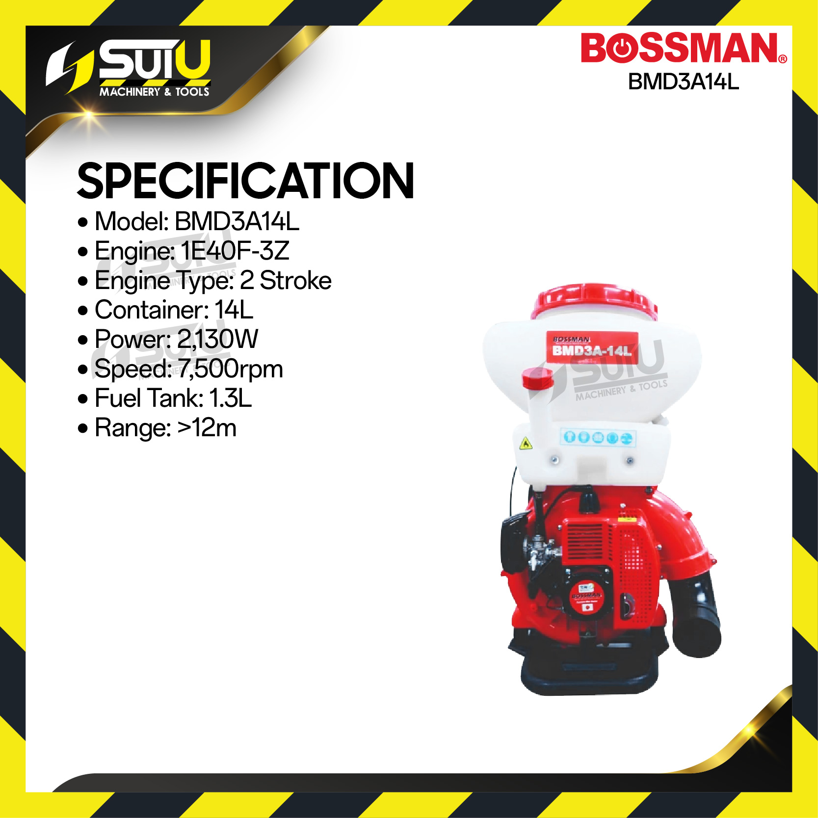 +PSPECIFICATIONS+P - Model : BMD3A14L - Engine : 1E40F-3Z - Engine Type : 2 Stroke - Container : 14L - Power : 2130W - Speed : 7500RPM - Fuel tank : 1.3L - Range : >12M