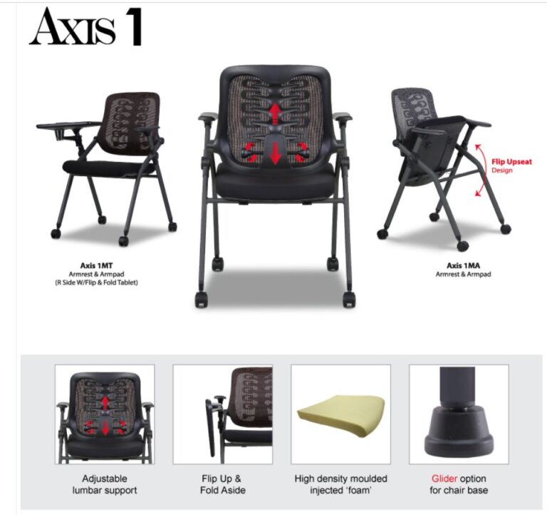 The Axis 1MT Foldable Study Chair is the ideal choice for modern learning and training environments. Equipped with a flip & foldable PP writing tablet on the right armrest, it also features a retractable cup holder — offering extra convenience during long sessions. The mesh backrest with lumbar support promotes better posture, while the foldable high-density foam seat ensures both comfort and space-saving functionality.