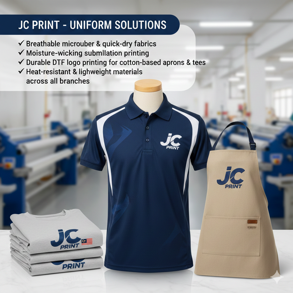 JC Print (JCP) delivers high-quality custom uniform solutions for restaurants, cafés, bakeries, catering services, food factories, and franchise chains across Malaysia.