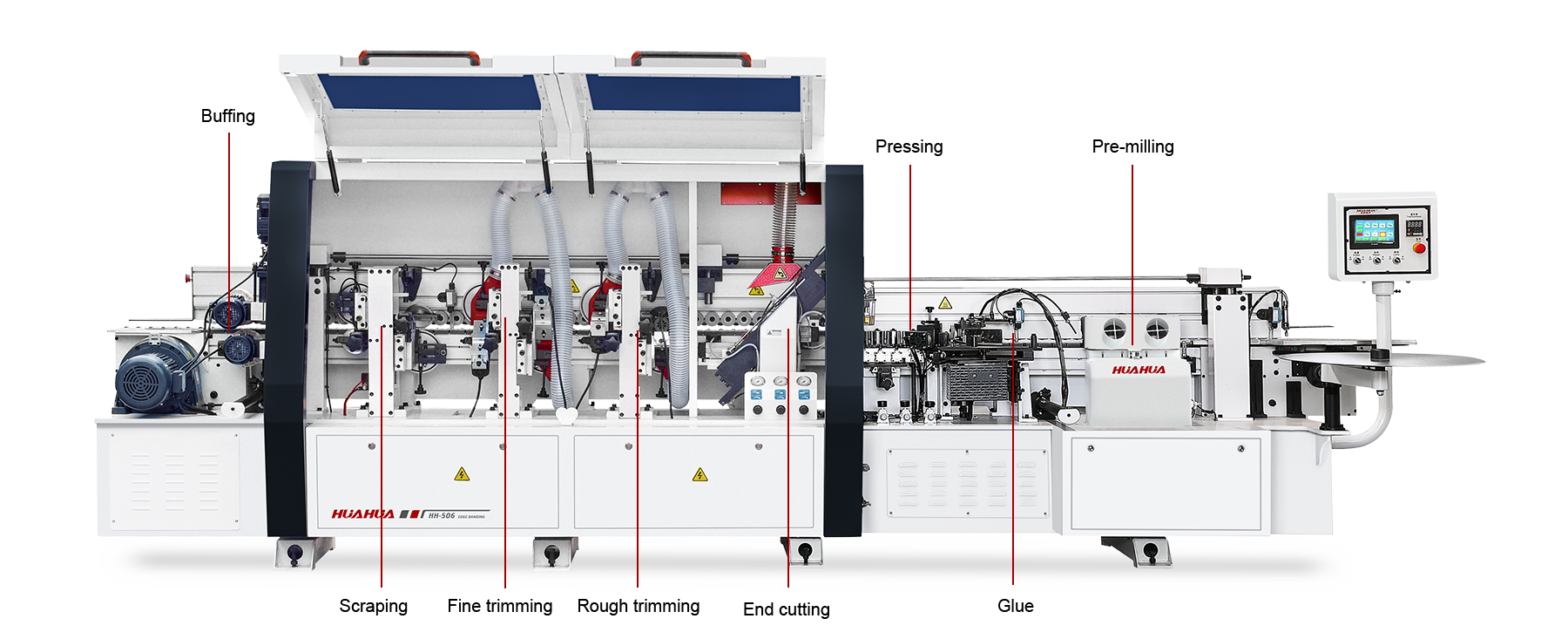 Through the precise linear guide rail movement, the automatic tracking of the profile and the fast cutting structure of the high-frequency high-speed motor are used to trim the protruding edge banding strips at the front end of the plate and the protruding edge banding strips at the rear end of the plate.