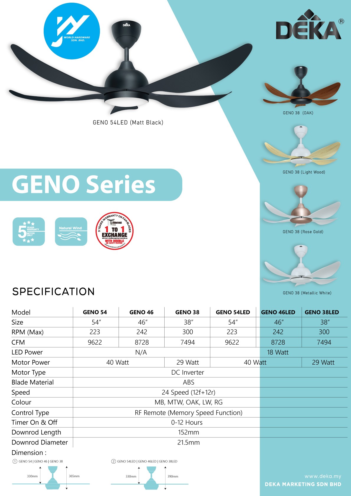 - Official warranty for fan AC motors (3 years), DC motors (5 years) and parts (1 year) are provided by DEKA Malaysia (except Sarawak).