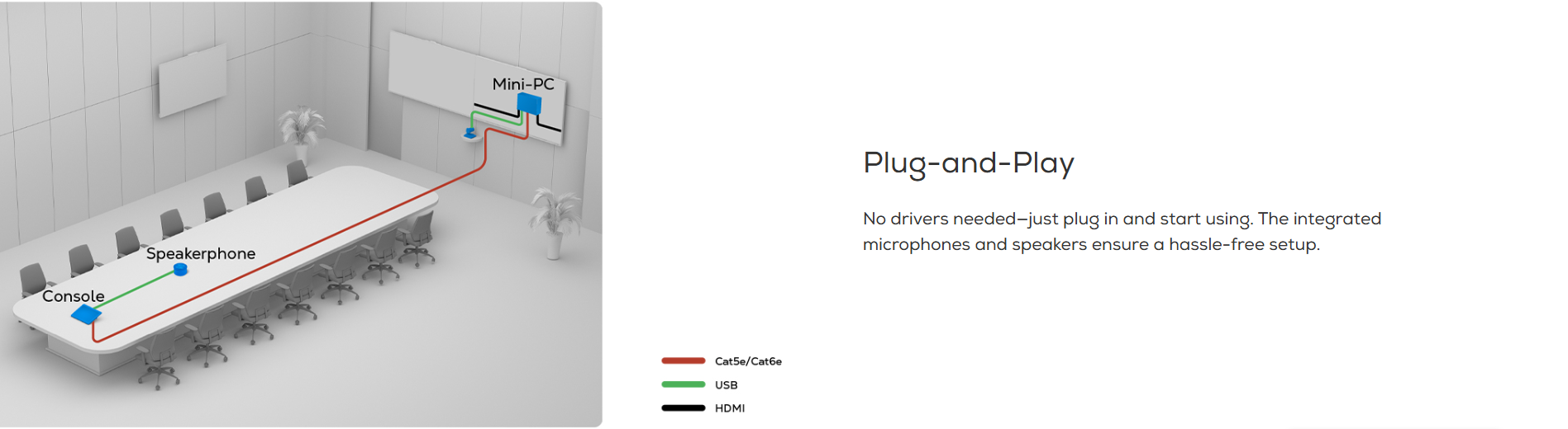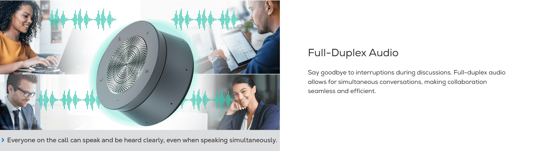 AI algorithms remove background noises like keyboard clicks and air conditioning, focusing solely on human voices. Combined with AI noise cancellation and AEC, it enhances focus and collaboration.