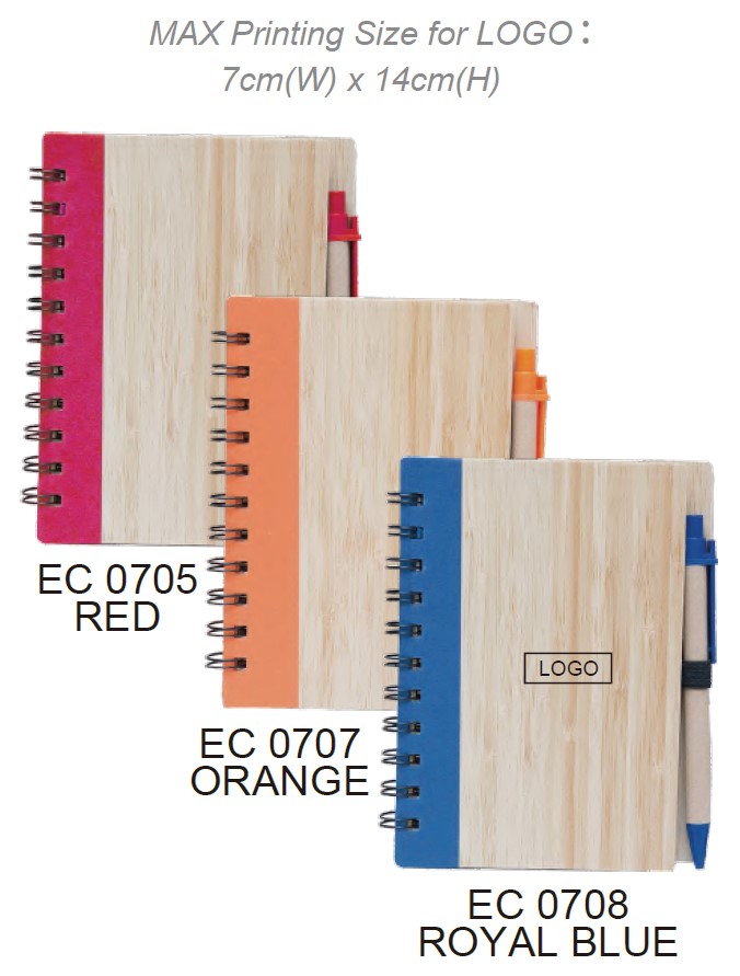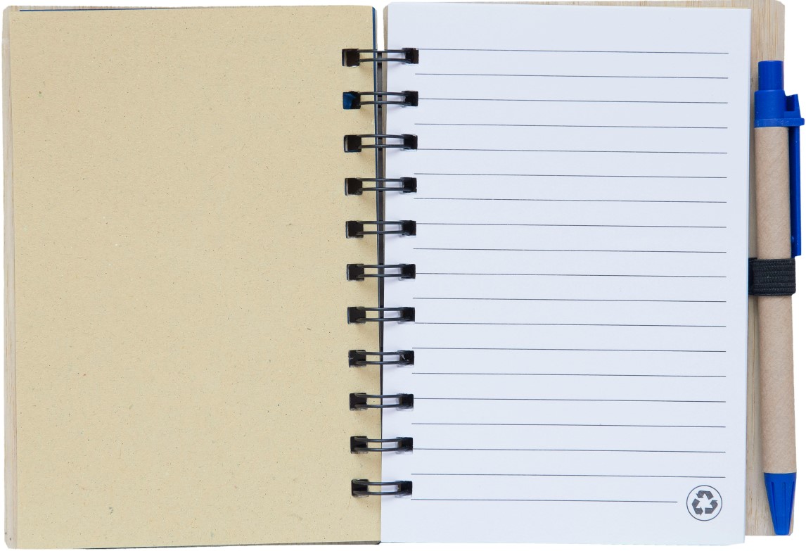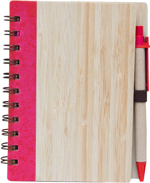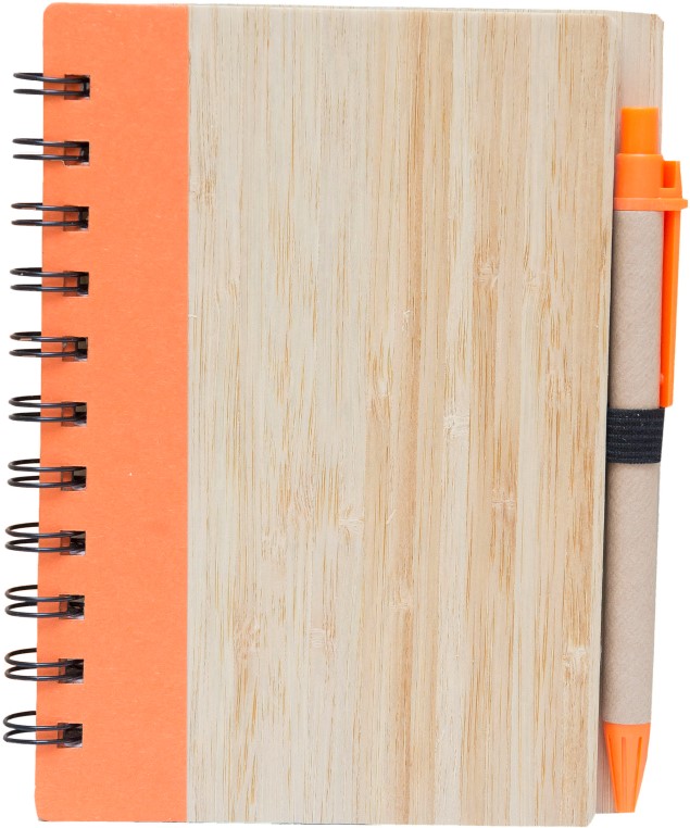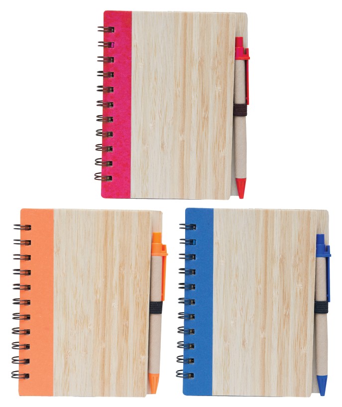 Material: Bamboo Cover with Pen — A stylishly compact and eco-friendly notepad made with a natural bamboo cover and a matching pen.