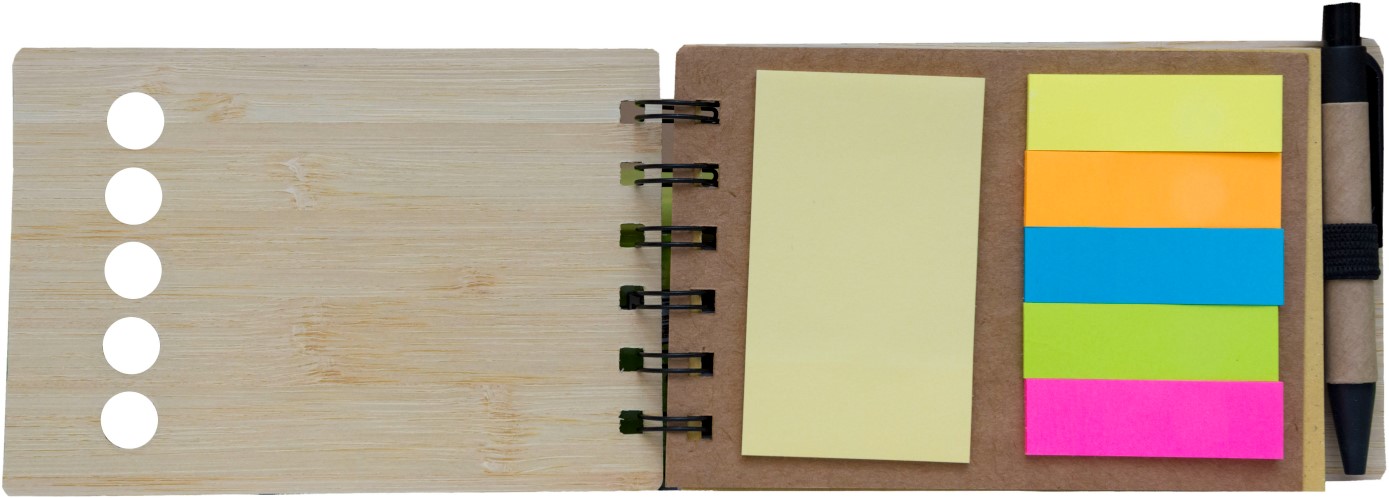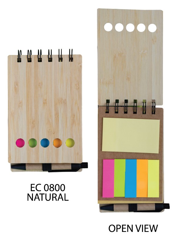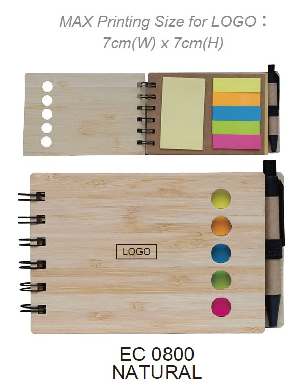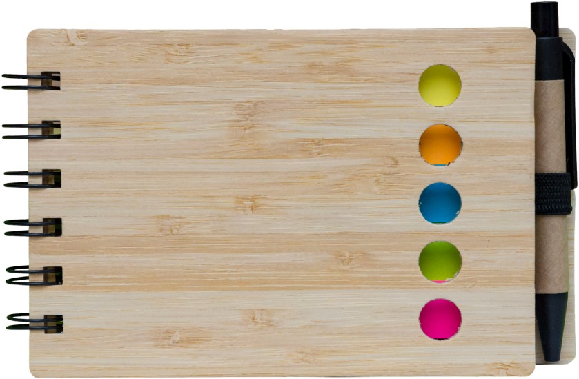 Material: Bamboo Cover with Pen — A stylishly compact and eco-friendly notepad made with a natural bamboo cover and a matching pen.