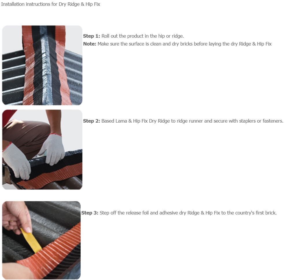 LAMA Ridge & Hip Dry Fix is an alternative solution to traditional wet cement mortar repair. The inner surface of aluminum coated its high stretchable ensure neat sealing between ridge / hip and tile while the water resistant fabric allows warm air trapped under one roof to escape and prevent water from seeping in. Lama Dry Ridge & Hip Fix has a self adhesive backing allows for the surface butyl repair themselves over to clean and dry tile effect.