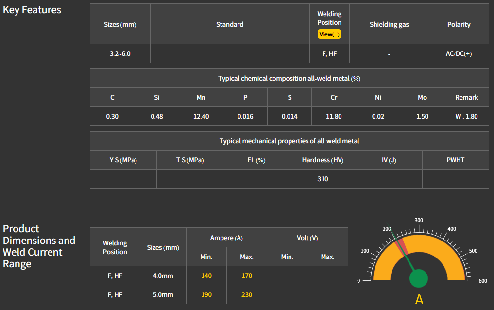 For wear resistance at elevated temperature. Hardfacing of ingot tongs, broaches and similars Served as both carbon dioxide and mixture gas, and stable arc performance in almost welding current