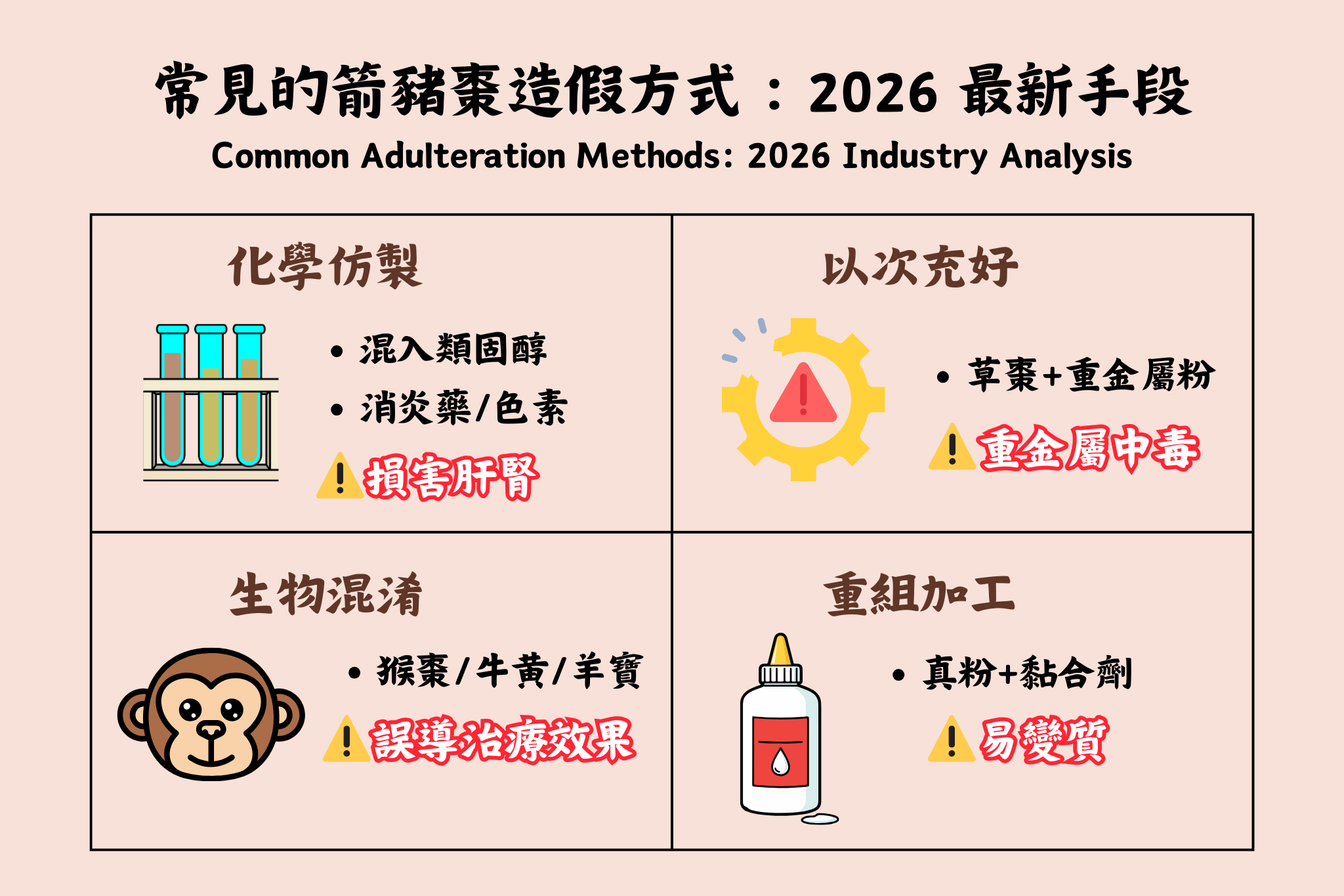 | 化學仿製 | 混入消炎藥、類固醇、工業色素 | 損害肝腎、誘發代謝紊亂 |