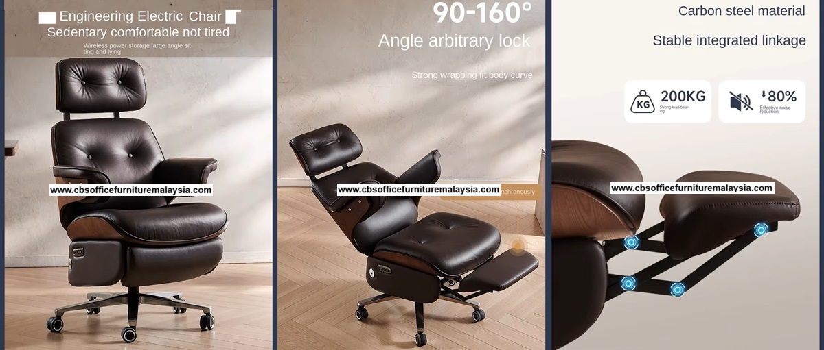 通过瑞吉斯电动总裁椅体验极致舒适与科技。具备一键式电动躺平、真皮材质以及 USB/Type C 充电功能。您的现代办公室完美行政椅,Cahaya Bintang Store 独家发售。