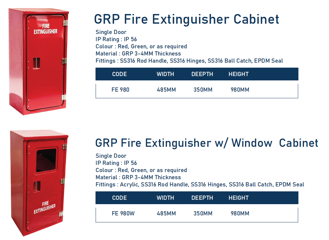 The FE 980 fire extinguisher cabinet from Joncan fits one 5Kg portable CO2 fire extinguisher or one twelve-litre fire extinguisher (max height 939mm), suitable for onshore and offshore use.