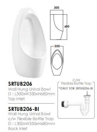 SORENTO SRTUB206-BI - Wall Hung Urinal Bowl c/w Flexible Bottle Trap (Back Inlet)