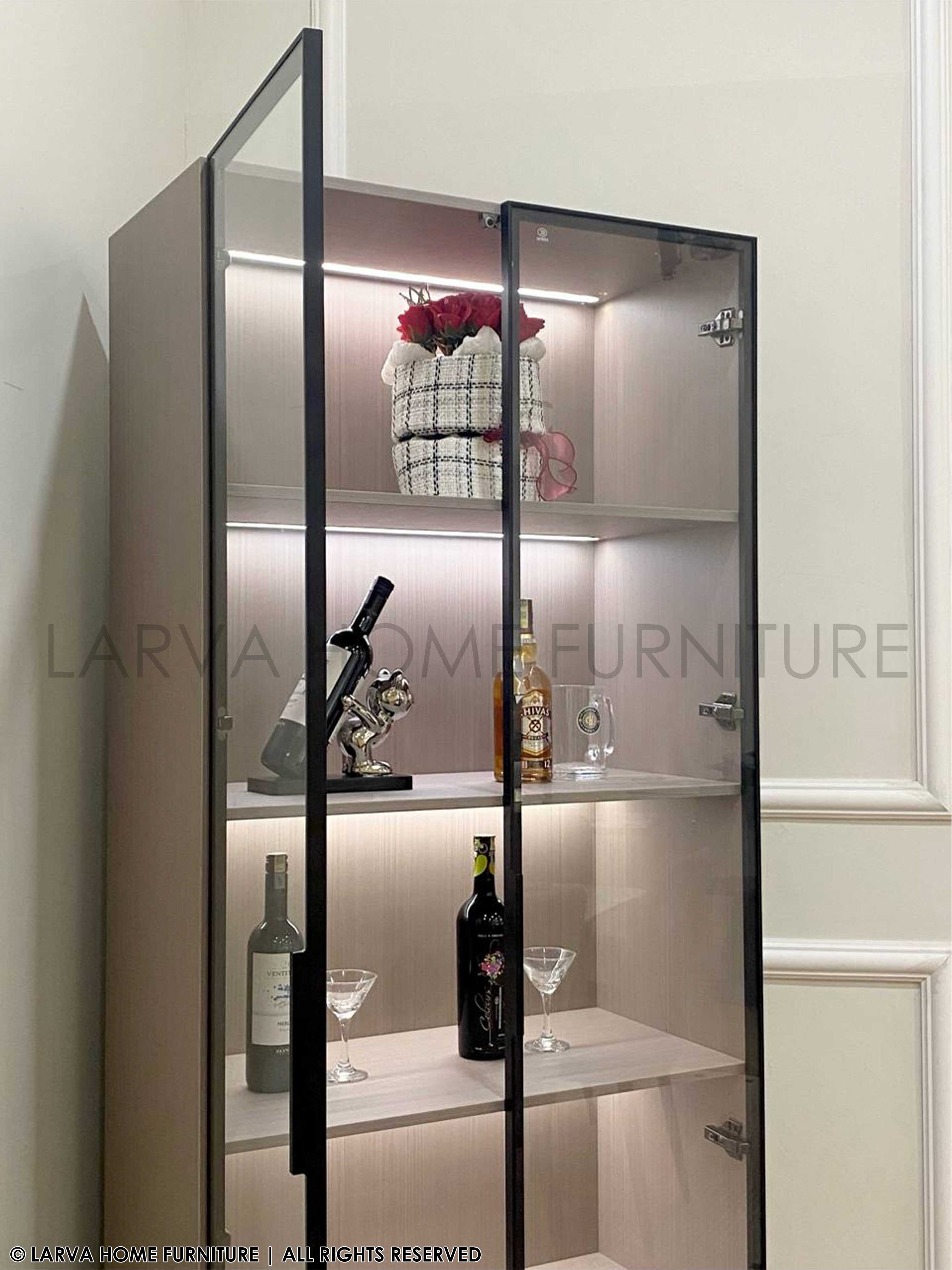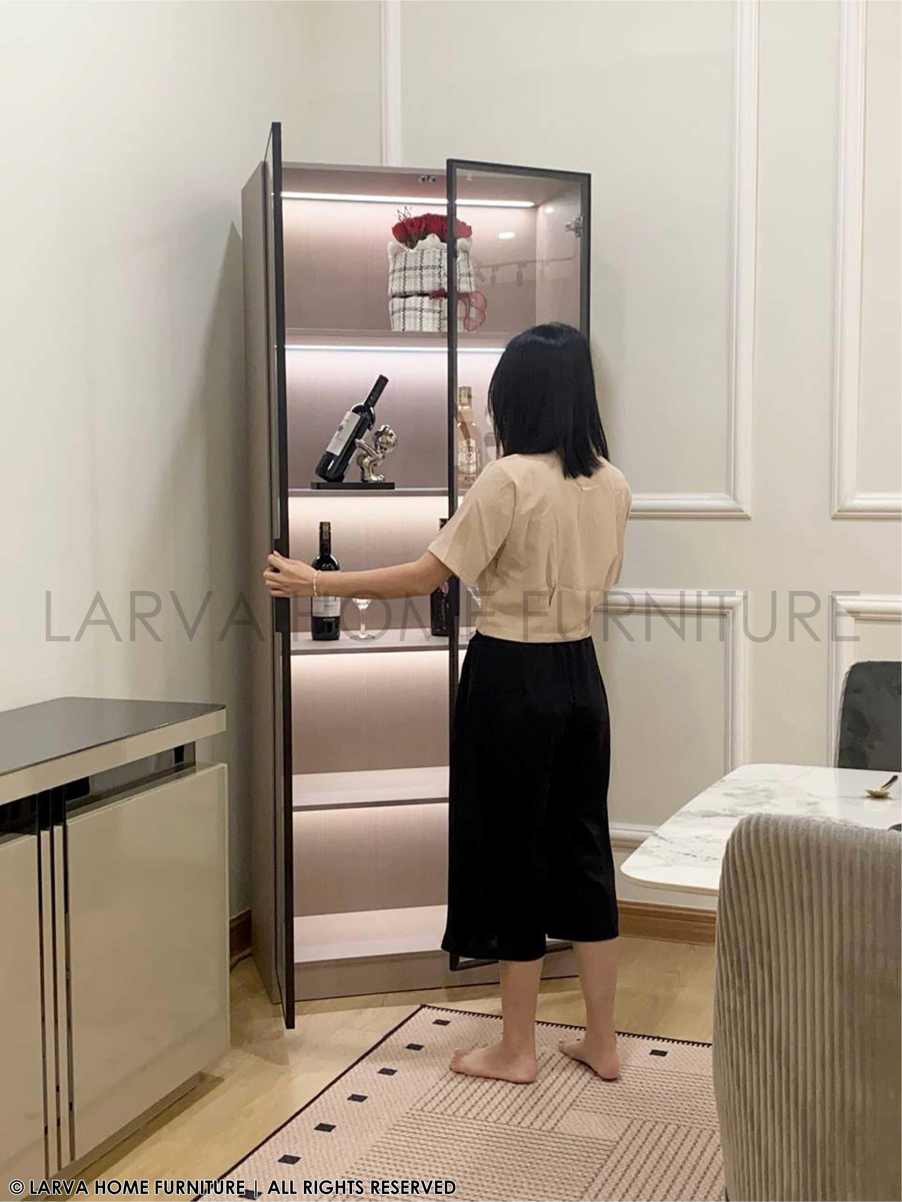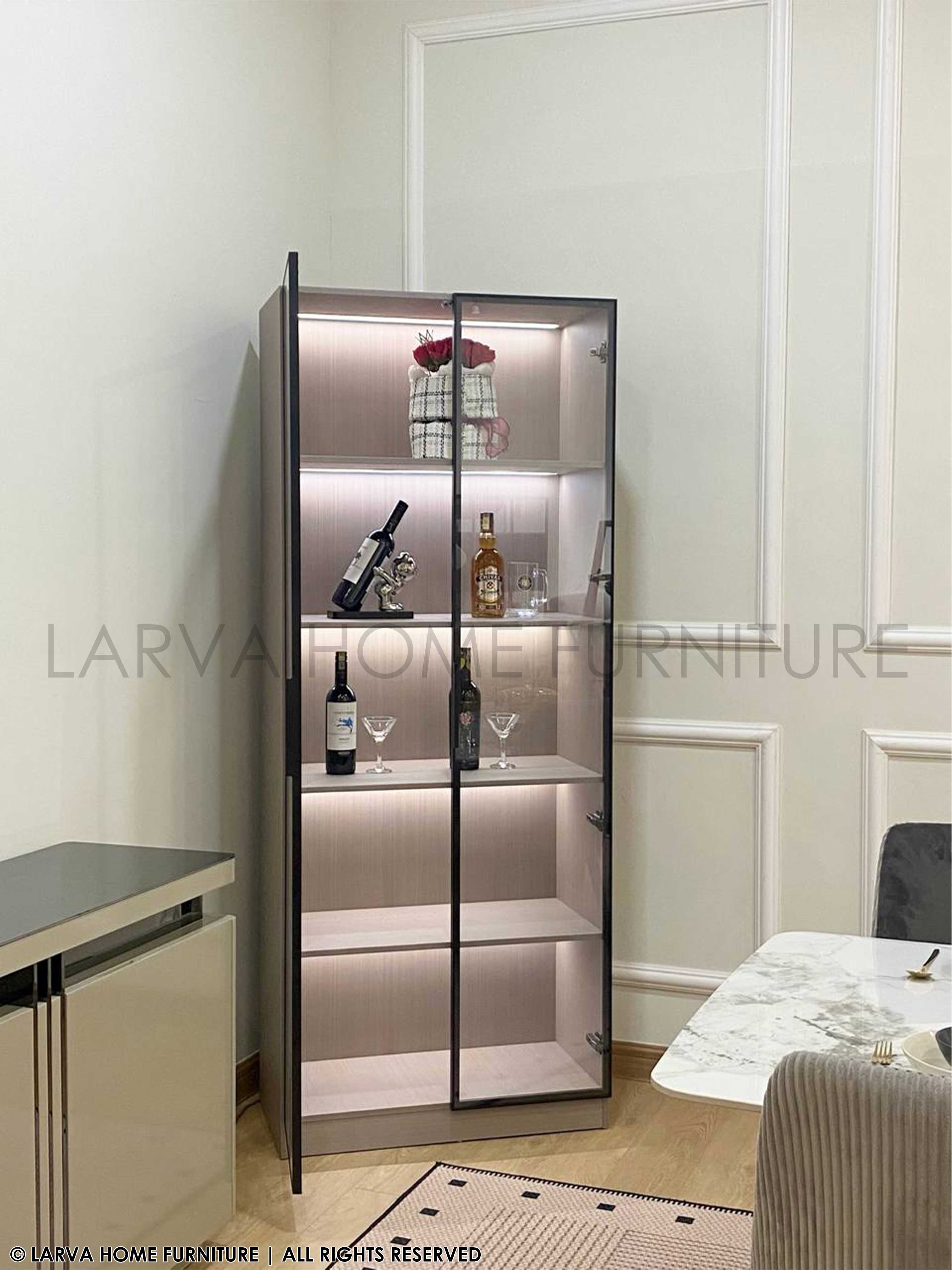 A showcase of elegance and personality. This Dario Display Cabinet turns your treasured items into a curated gallery of memories. The glass panels and warm lighting add a subtle glow of sophistication, while its sturdy modern frame keeps things grounded in timeless design. A perfect harmony of modern luxury and heartfelt homeliness.