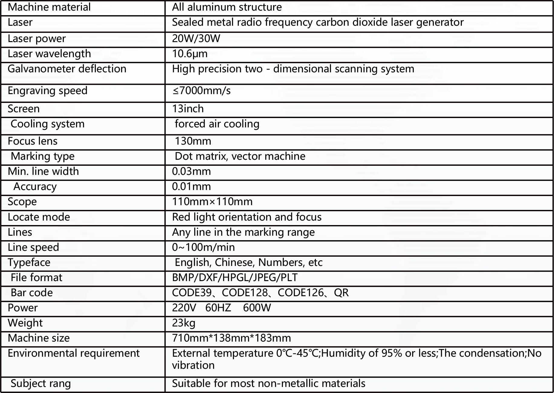 Function Introduction: Laser marking machines are mainly used for marking the surface of materials such as cartons, bags, beverages, labels, bottles, films, plastics, glass, wood, pens, metal, mobile phones, etc. Laser printing English, Chinese, numbers, symbols, barcodes, etc. Compared with the ink jet printer, it has the following advantages: No ink saving, no need for cleaning, no blockage, high-grade printing, non-erasable, long life.