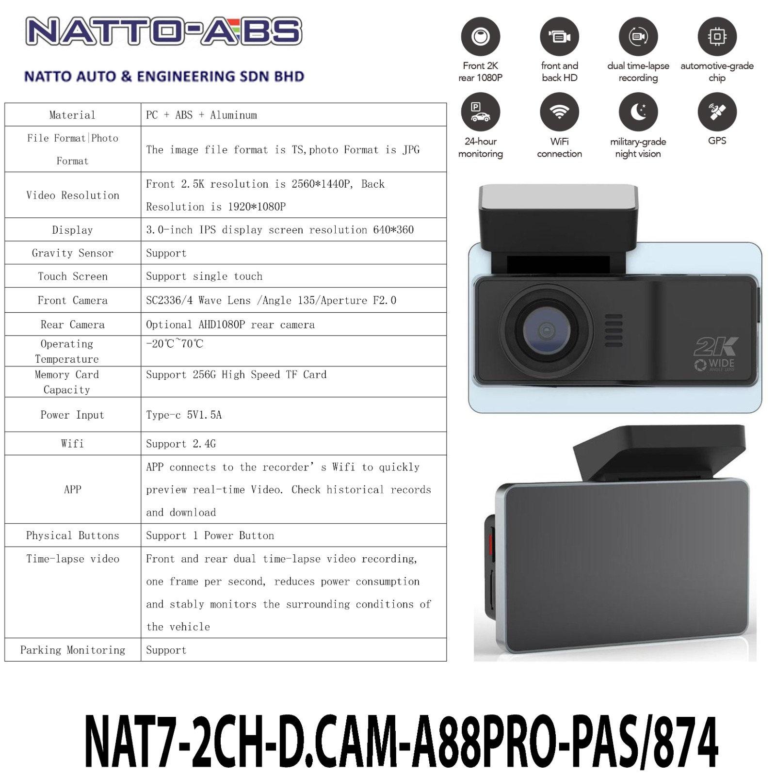 Introducing the NATTO ABS Dashcam A88 Pro (Front: 2K / Rear: 1080P), your ultimate witness on the road. Engineered with automotive-grade chips and military-grade night vision, this dashcam ensures you never miss a detail—day or night.