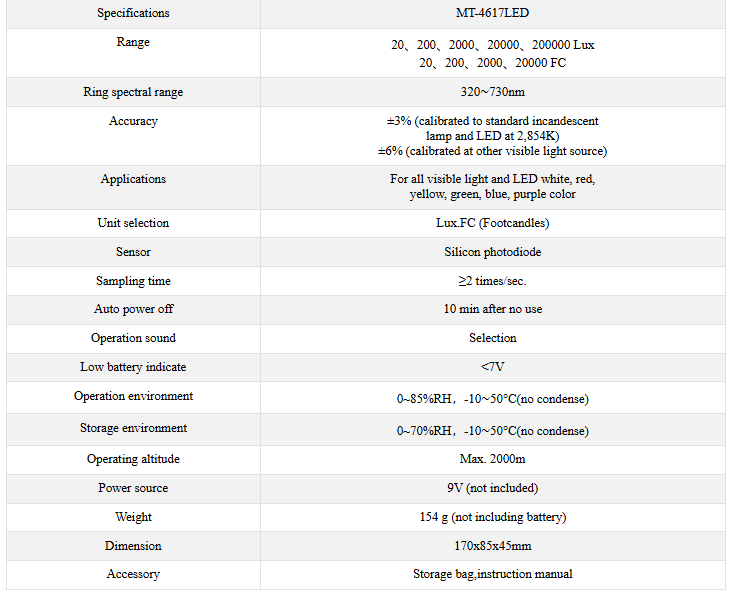 sodium lamp or electric incandescent lamp. Measuring range is up to : 0.00~200000 Lux / 0∼20000 FC