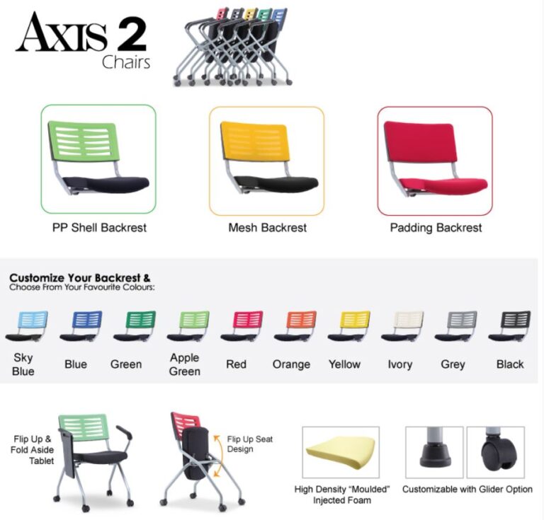 The KT-AXIS2P Study Chair is built for comfort, mobility, and versatility. With a padded backrest, foldable seat, and smooth twin-wheel castors, this chair is ideal for training rooms, classrooms, offices, or any environment where flexibility and space-saving furniture are essential.