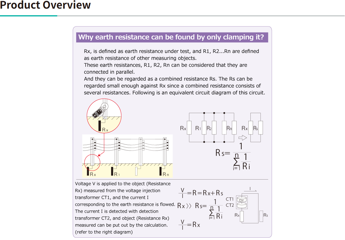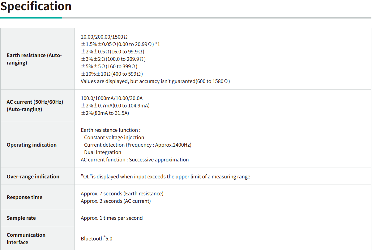 - The earth resistance from 0.05 to 1500Ω can be measured without the auxiliary earth spikes in multi-earthing systems
