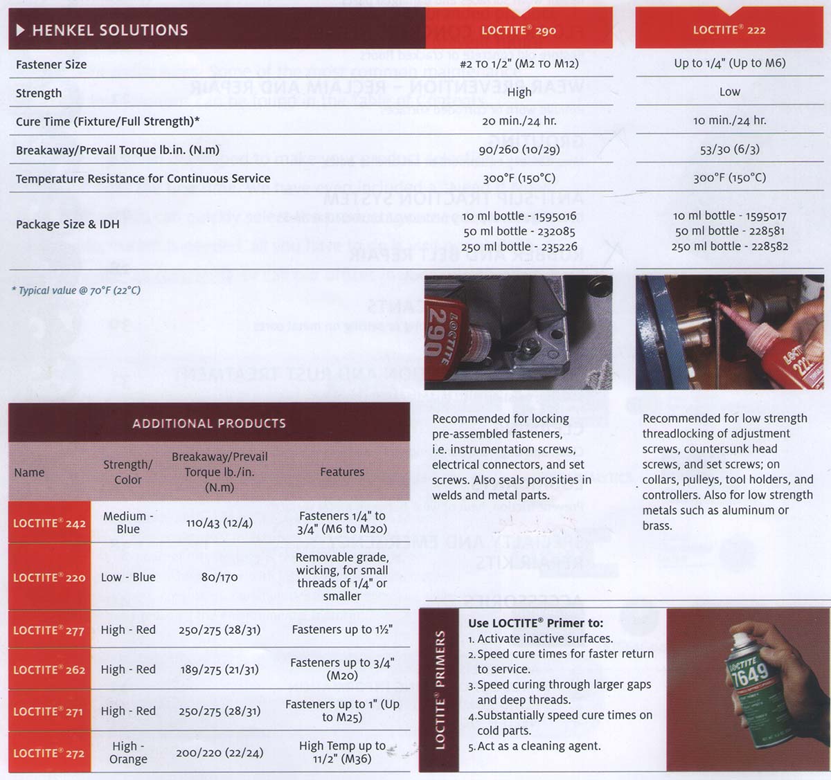 If you’re working with small diameter screws made of low strength metals (e.g., aluminum or brass), try LOCTITE® 222. It is ideal for low-strength threadlocking of adjustment screws, countersunk head screws, and set screws; on collars, pulleys, tool holders and controllers. It works on most metals without primer, including passive substrates such as stainless steel, aluminum and plated surfaces. It also cures through light coatings of corrosion prevention oils without having to clean the parts.