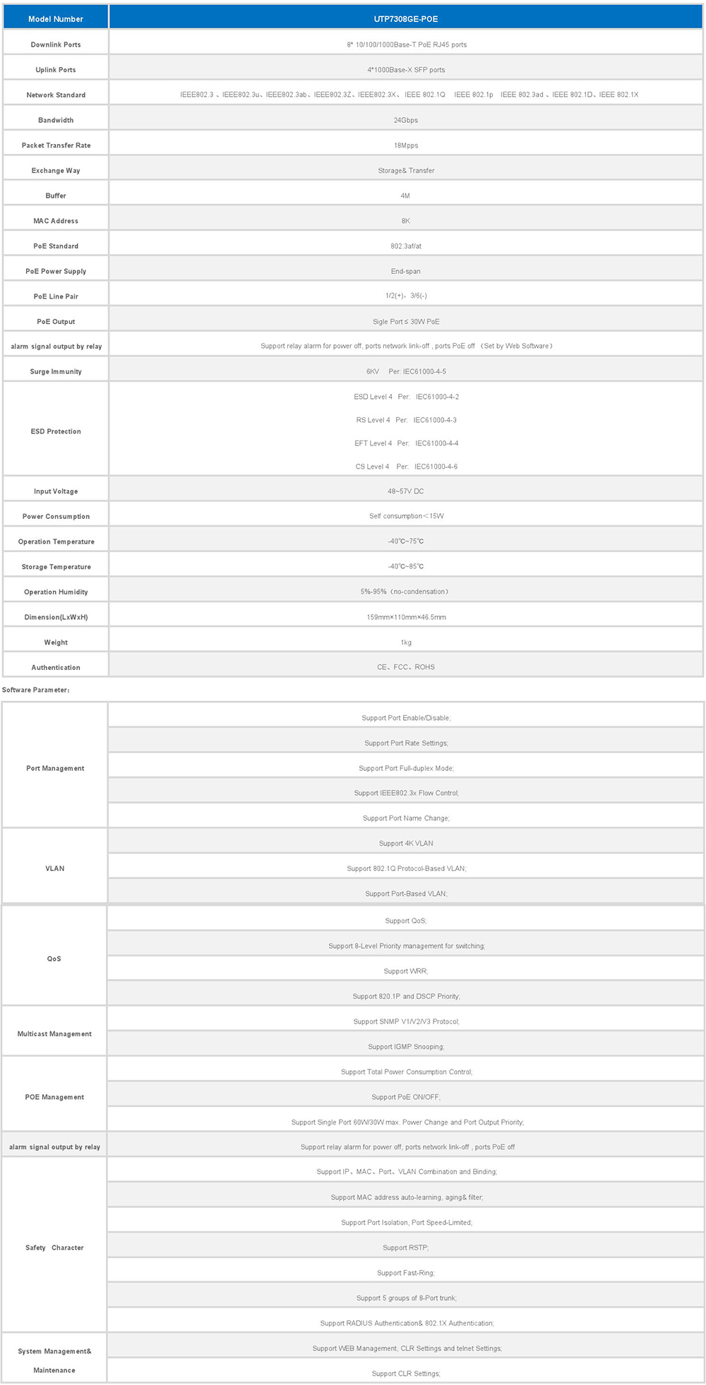 UTP7308GE-POE is 8 Ports Industrial Full Gigabit PoE Managed SwitchProvide 8* 10/100/1000Base-T Ethernet ports(PoE), 4 * 1000BASE-X SFP ports(Unlinks). The switch provides up to 4Mbit cache, Support 4K high-definition video transmission. Besides, the 8 downlink PoE ports support IEEE802.3af/at standard. PoE output power of single port is up to 60W , support high-speed dome; support Web-based network management, support VLAN, QoS, RSTP, SNMP etc. network function; Working temperature 40℃~75℃, strong level of protection from lightning, anti interference. It fully satisfies the needs of security video surveillance project.