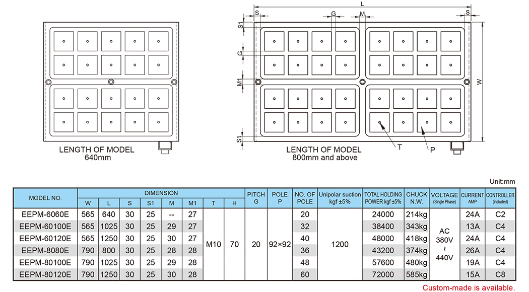 Minimum size of workpiece required as 4 alternate magnetic square poles and above contacts is necessary for optimum clamping.