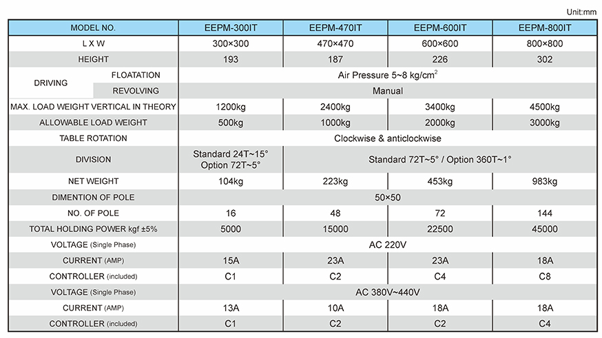Structure of Electro-Permanent Magnetic Chuck, 3~10 seconds control for power ON & OFF. No electric power supply required to keep the chuck ON. So no electric cable disturbed, can be turning freely.