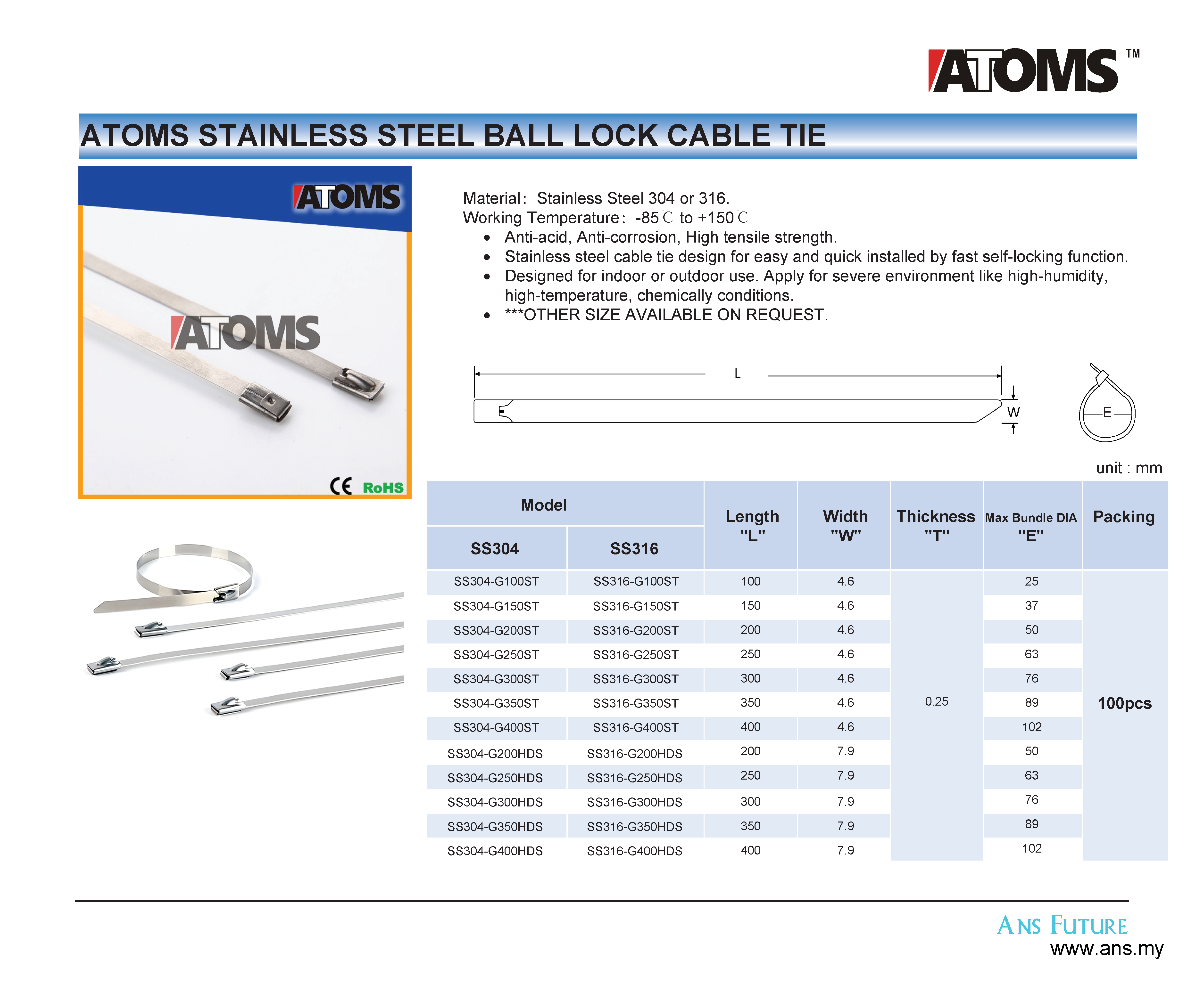 ATOMS Stainless Steel Cable Tie (SS304)