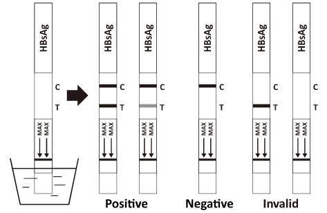 Note: A low HBsAg concentration might result in a weak line appearing in the test region (T) after an extended period of time; therefore, do not interpret the result after 30 minutes.
