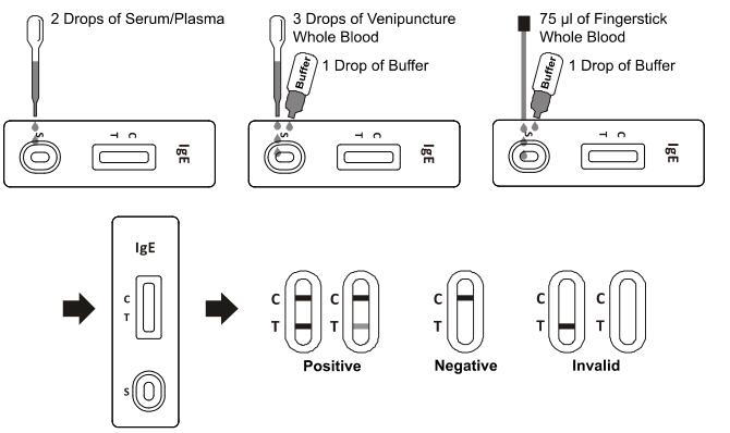 Hold the dropper vertically and transfer 2 drops of serum or plasma (approximately 50μL) to the specimen well, and start the timer. See illustration below.