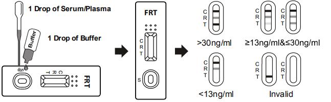 2. Place the cassette on a clean and level surface. Hold the dropper vertically and transfer 1 full drop of serum or plasma (approximately 25ul) to the specimen well of the cassette, then add 1 drop of buffer (approximately 40 ul) and start the timer. Avoid trapping air bubbles in the specimen well. See illustration below.