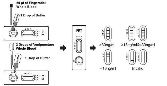· To use a capillary tube: Fill the capillary tube and transfer approximately 50 ul of fingerstick whole blood specimen to the specimen well of test cassette, then add 1 drop of buffer (approximately 40 ul) and start the timer. See illustration below. Wait for the colored line(s) to appear. Read result at 5 minutes. Do not interpret the result after 10 minutes.
