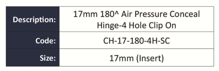 17MM 180^ AIR PRESSURE CONCEAL HINGE-4 HOLE CLIP ON