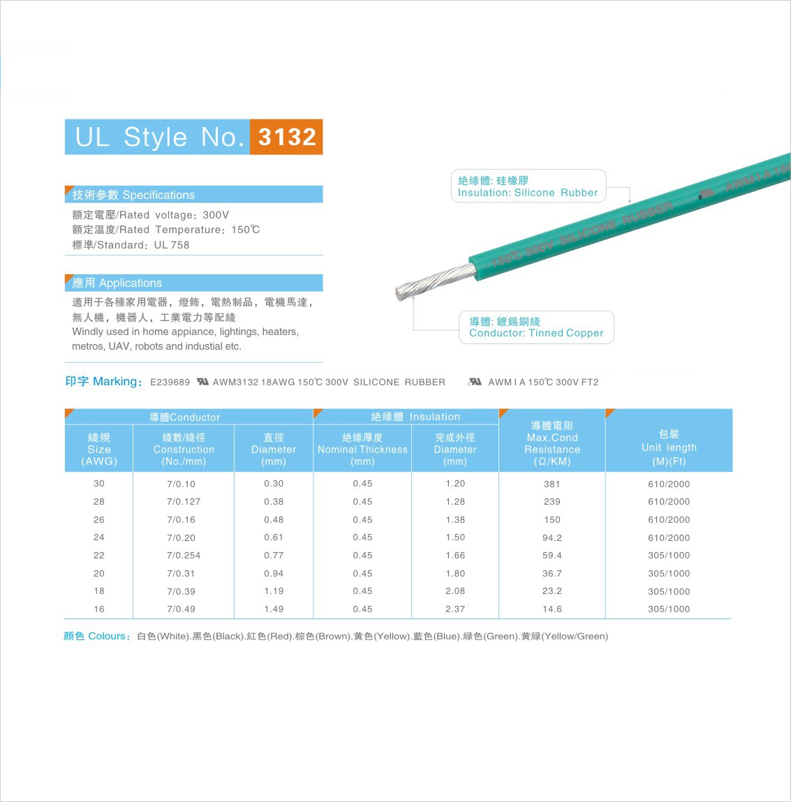 UL3132 300V 150℃ Silicone rubber wire:300V 150℃ UL stype AWM3132:16AWG-30AWG Flametibility level:FT-2