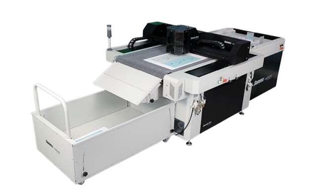 The oversized feeder and the withdrawal system automatically pick up and load the materials onto the cutting machine. The automatic crop mark detection enables a hands-free cutting process.