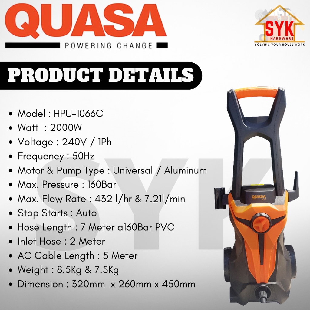Product Specification About Quasa HPU-1066C 160BAR 2000W High Pressure Cleaner Car Pressure Washer Water Jet Mesin Cuci Kereta Lantai