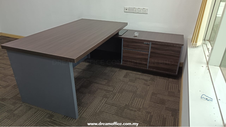 This elegantly designed premium director table combines modern aesthetics with superior functionality. Crafted from high-quality engineered wood and finished in a rich walnut tone with contrasting matte dark grey panels, it creates a commanding presence in any executive workspace. The L-shaped configuration provides workspace and a dedicated return unit for enhanced storage and organization.