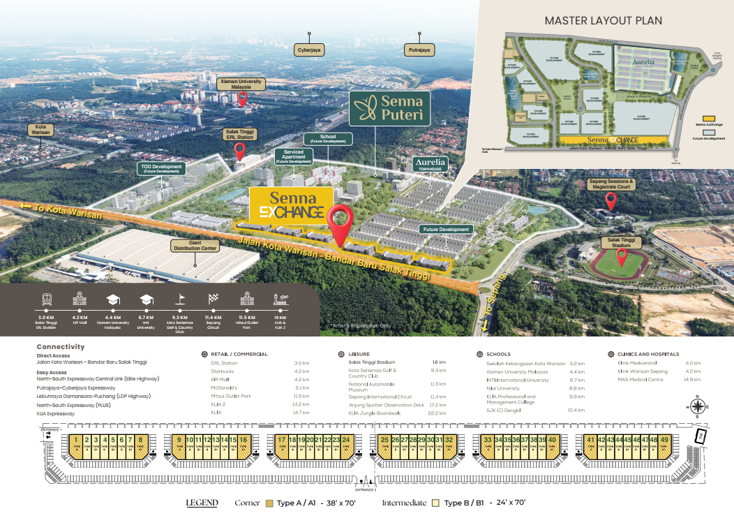 Strategically located with prominent visibility along Jalan Kota Warisan–Bandar Baru Salak Tinggi, Senna ExChange enjoys close proximity to the old town centre of Salak Tinggi and is only minutes away from the bustling Kota Warisan commercial district.