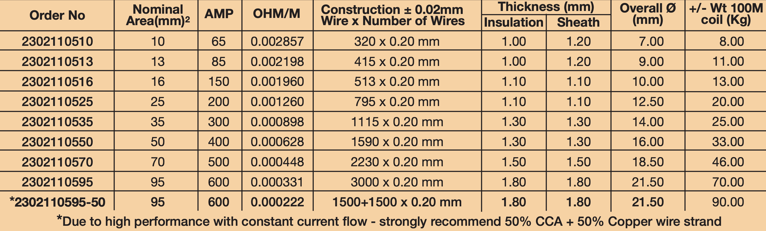 ORANGE CCA Flexible Welding Cable Guarantees its specifications (within Tolerance Limit) 100 meters length IS 100 meters: Nominated mm2. Area as specified: Specified 0.20mm Diameter IS 0.20mm Diameter Specifications