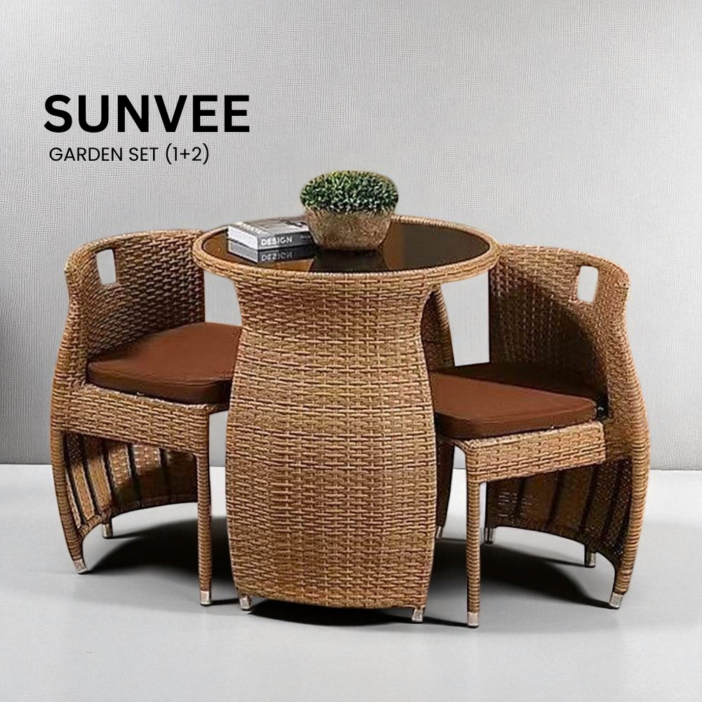 Featuring a plastic rattan body with a glass-surfaced table and two matching chairs with rattan legs, backrest, and cushioned fabric seats, the SUNVEE set blends practicality with a clean, modern look. Whether for casual coffee mornings, evening relaxation, or small outdoor gatherings, this compact set fits seamlessly into any home, café, or resort environment.