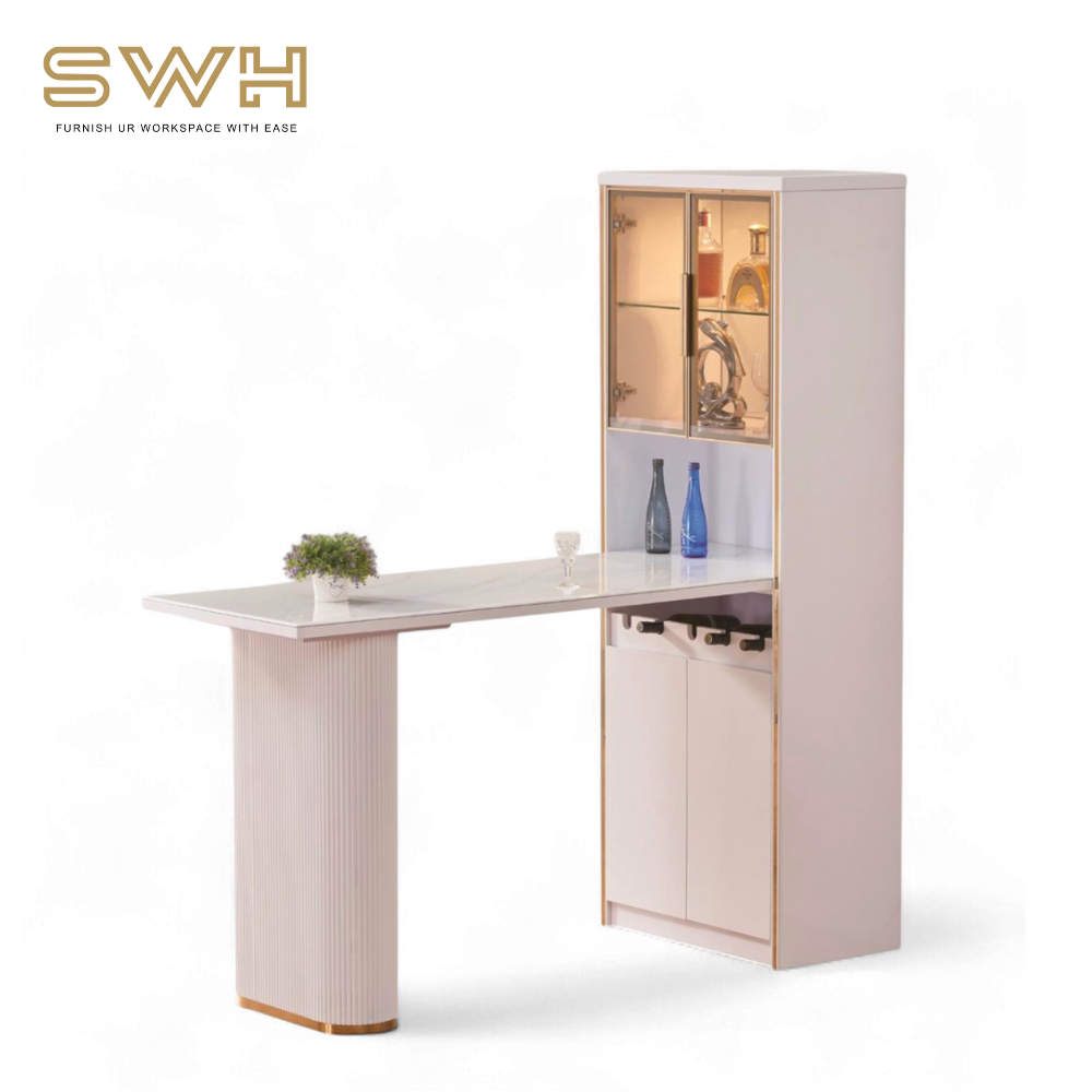 Bring style and function into your home or commercial space with the ICONIC Bar Counter Table Divider. Designed with a blend of HDF 3D veneer, sleek white high-gloss finish, MicroStone top, and aluminum grey-glass doors, this bar counter adds both sophistication and practicality.