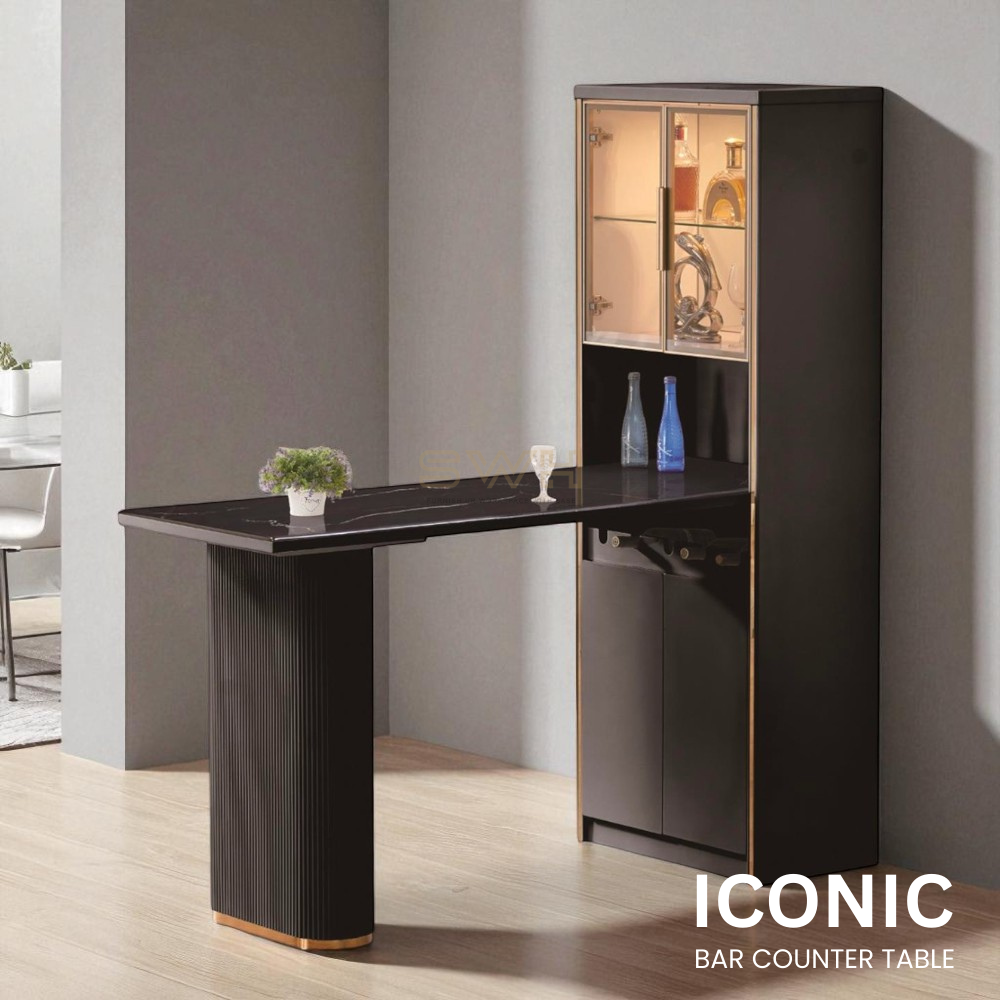 Upgrade your interior with the ICONIC Bar Counter Table Divider, now available in a sleek black-painted finish. Designed with a mix of HDF 3D veneer, MicroStone top, and aluminum grey-glass doors, this piece balances elegance and durability, making it ideal for modern homes, cafés, or offices.