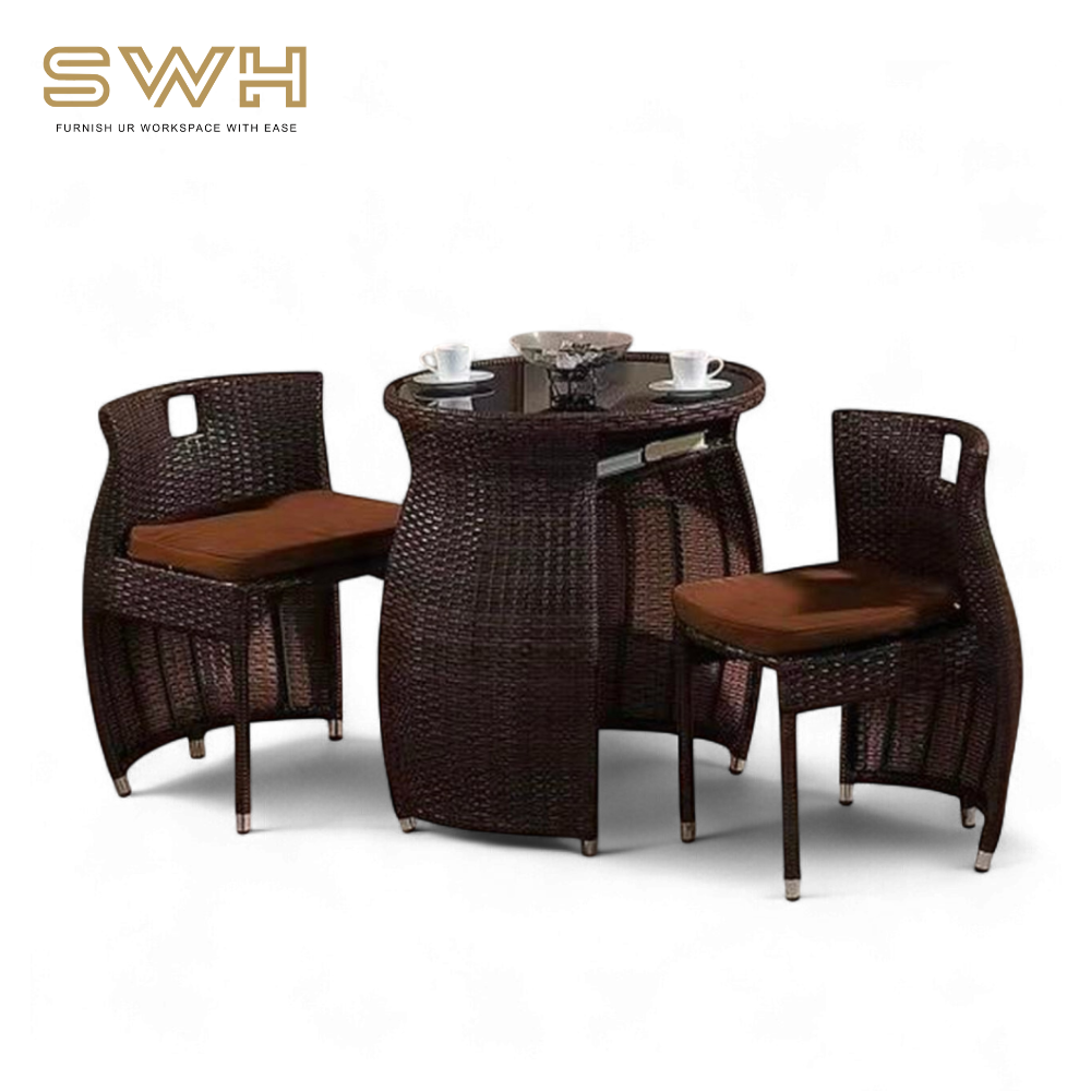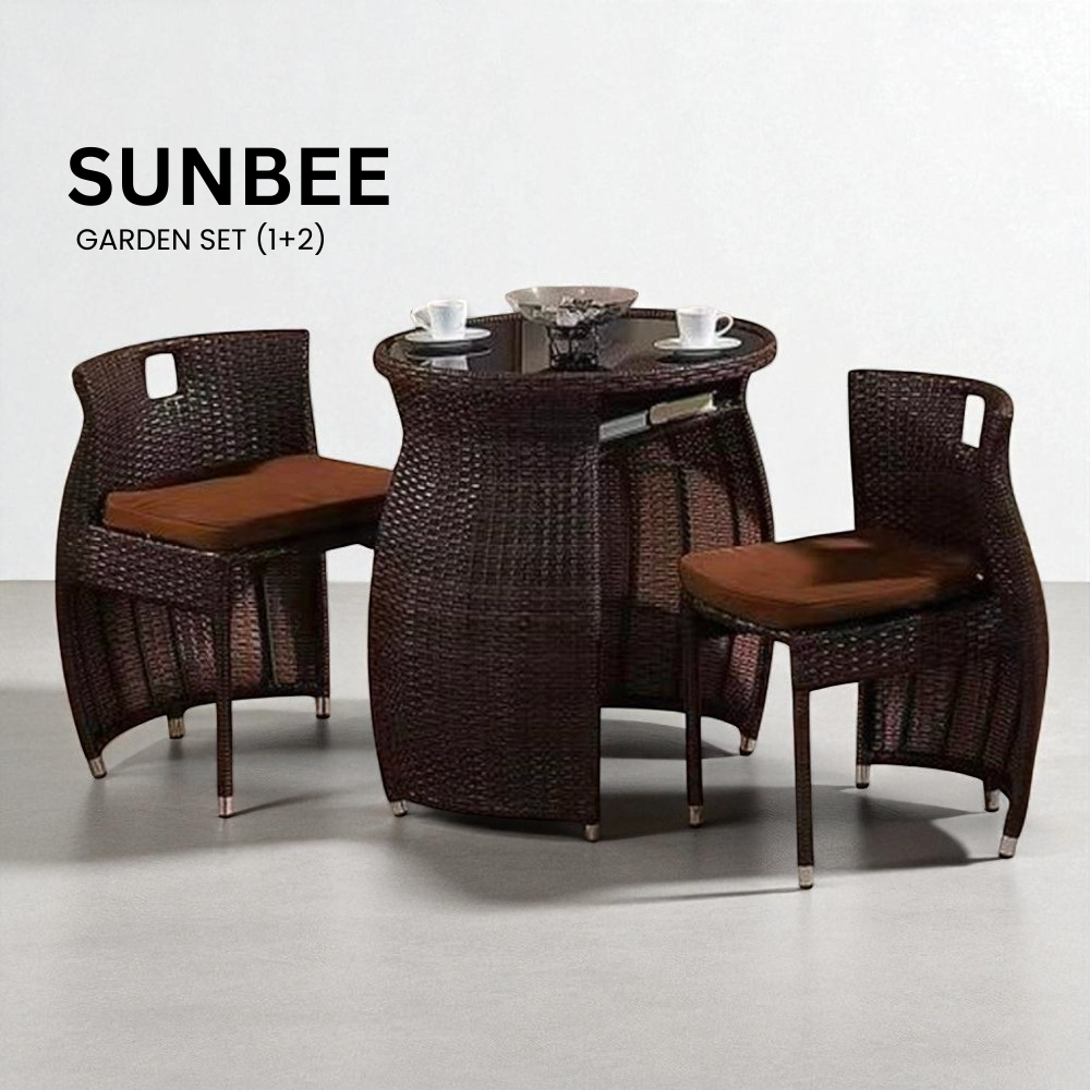 Bring a touch of warmth and natural charm to your outdoor space with the SUNBEE Outdoor Table & Chair Set (1+2). Designed with a dark brown rattan body and glass surface table, paired with rattan frame chairs with cushioned fabric seats, this set is perfect for balconies, patios, gardens, or cafés.