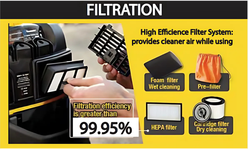 TRIPLE FILTRATION, ON BOARD ACCESSORY STORAGE AND A LARGE DUST-SELAED ON/OFF SWITCH.