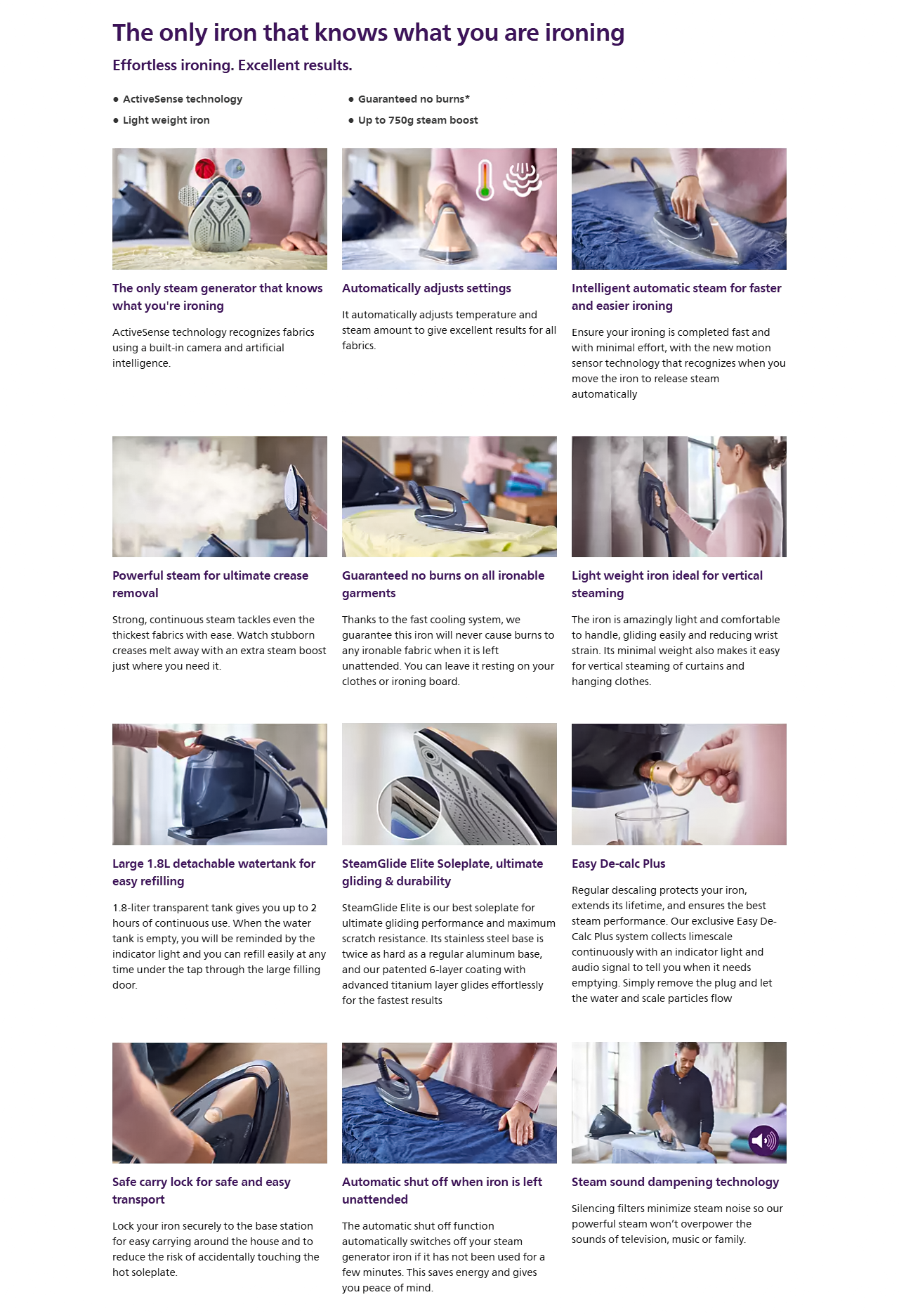 PerfectCare 9000 Series comes with the world's first fabric sensing technology called ActiveSense. Using a built-in camera and AI, it knows what you are ironing and adjusts the ideal temperature and steam amount for effortless results.