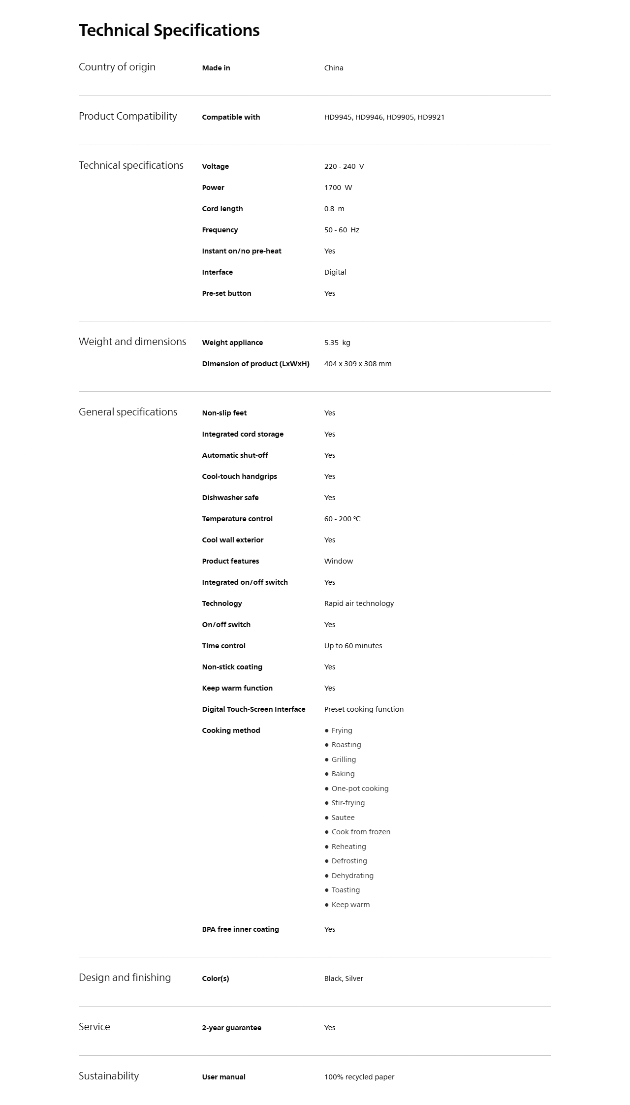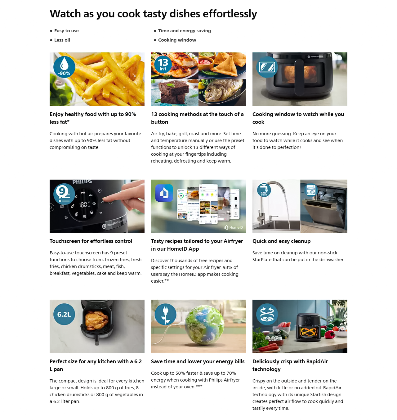 Crispy outside, tender inside. Unique RapidAir technology saves time and energy, without compromising on taste. Watch through the cooking window while your favorite ingredients turn into delicious food in under 15 minutes.