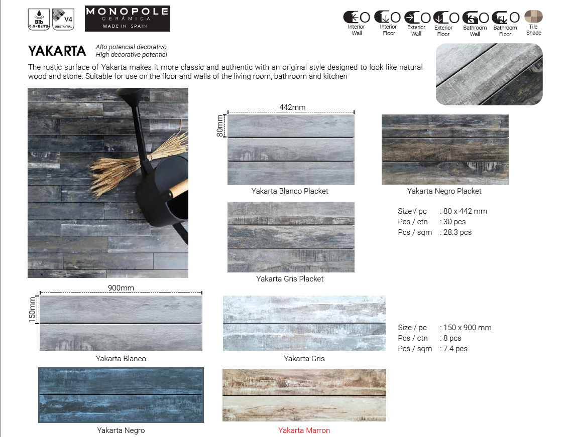 Code : YAKARTA NEGRO Brand: GNG Series: YAKARTA Size/pc : 15 x 90 cm Pcs/ctn : 8 pcs Surface: Matt Design Variation: V4 Face: Colour: Negro Style: Decorative Applications: Wall/Floor